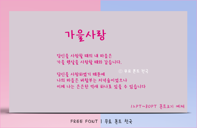무료 폰트 천국에서 제공하는 폰트 사용 범위, 저작권 정보는 최신 정보가 아닐 수 있으며 폰트 사용과 관련된 자세한 사항 및 사용 정보는 아래 게시된 '폰트 소유권' 홈페이지를 참고하시면 됩니다. TTF 파일은 폰트 폴더에 복사해서 사용하셔야 하며, EXE로 된 설치 배포형 폰트의 경우 설치를 하시면 폰트가 자동 적용됩니다.