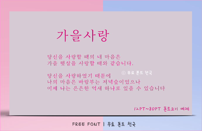 무료 폰트 천국에서 제공하는 폰트 사용 범위, 저작권 정보는 최신 정보가 아닐 수 있으며 폰트 사용과 관련된 자세한 사항 및 저작권 정보는 아래 게시된 '폰트 소유권' 홈페이지를 반드시 참고하셔서 사용하세요. TTF 파일은 폰트 폴더에 복사해서 사용하셔야 하며, EXE로 된 설치 배포형 폰트의 경우 설치를 하시면 폰트가 자동 적용됩니다.